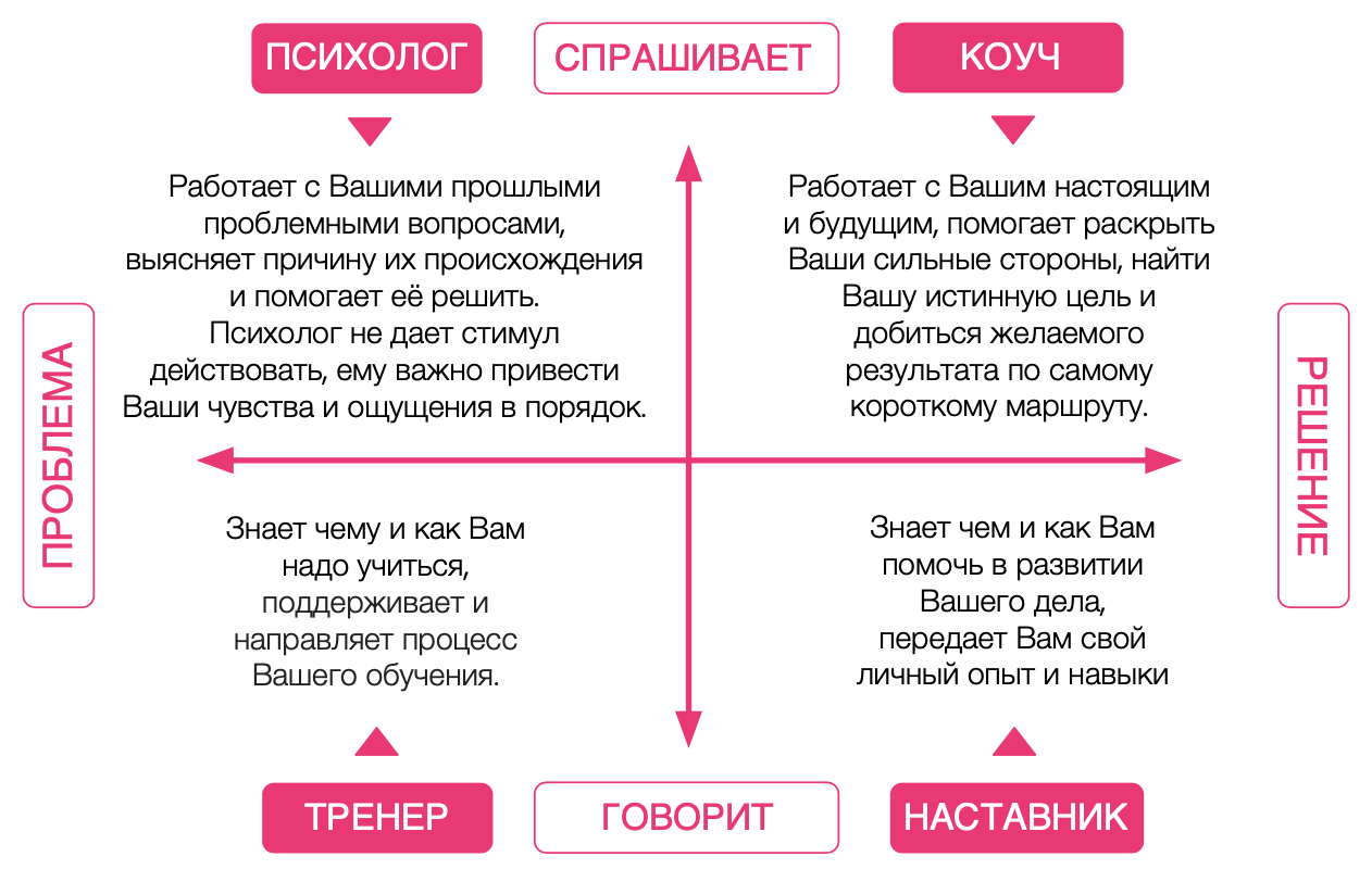| - человек, который выводит клиента на новый уровень и помогает ему добиться желаемых целей стимул и мотивация. | - человек, который работает с чувствами и внутренним состоянием. |